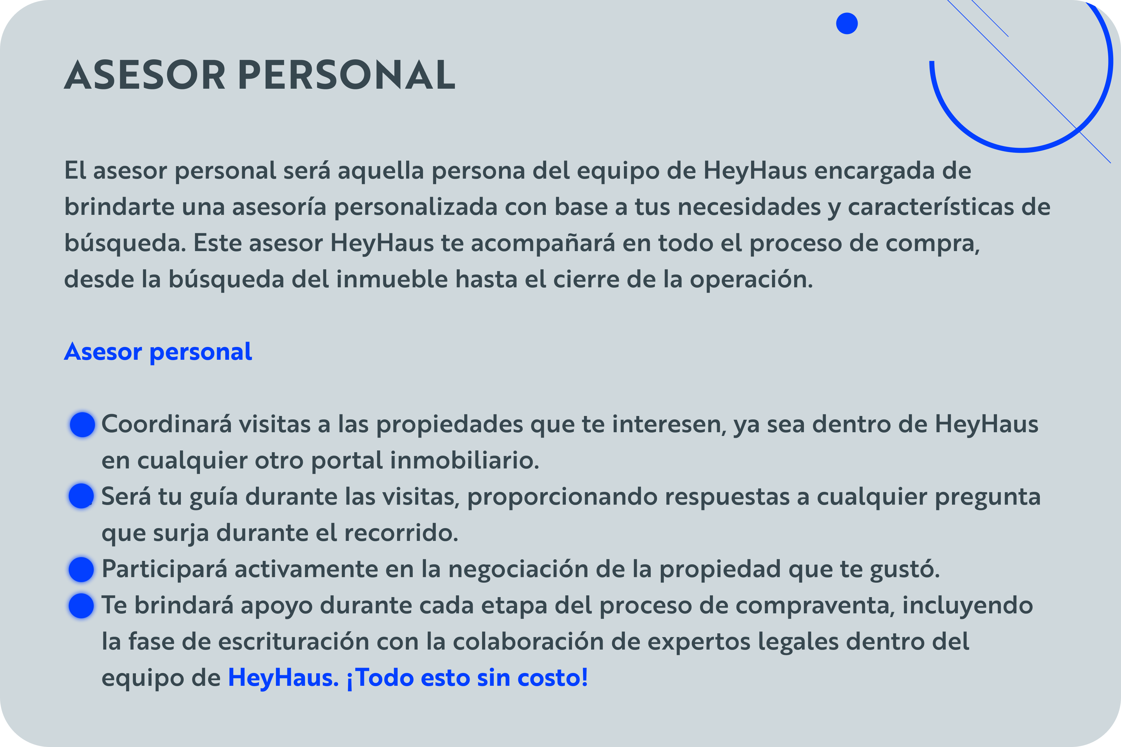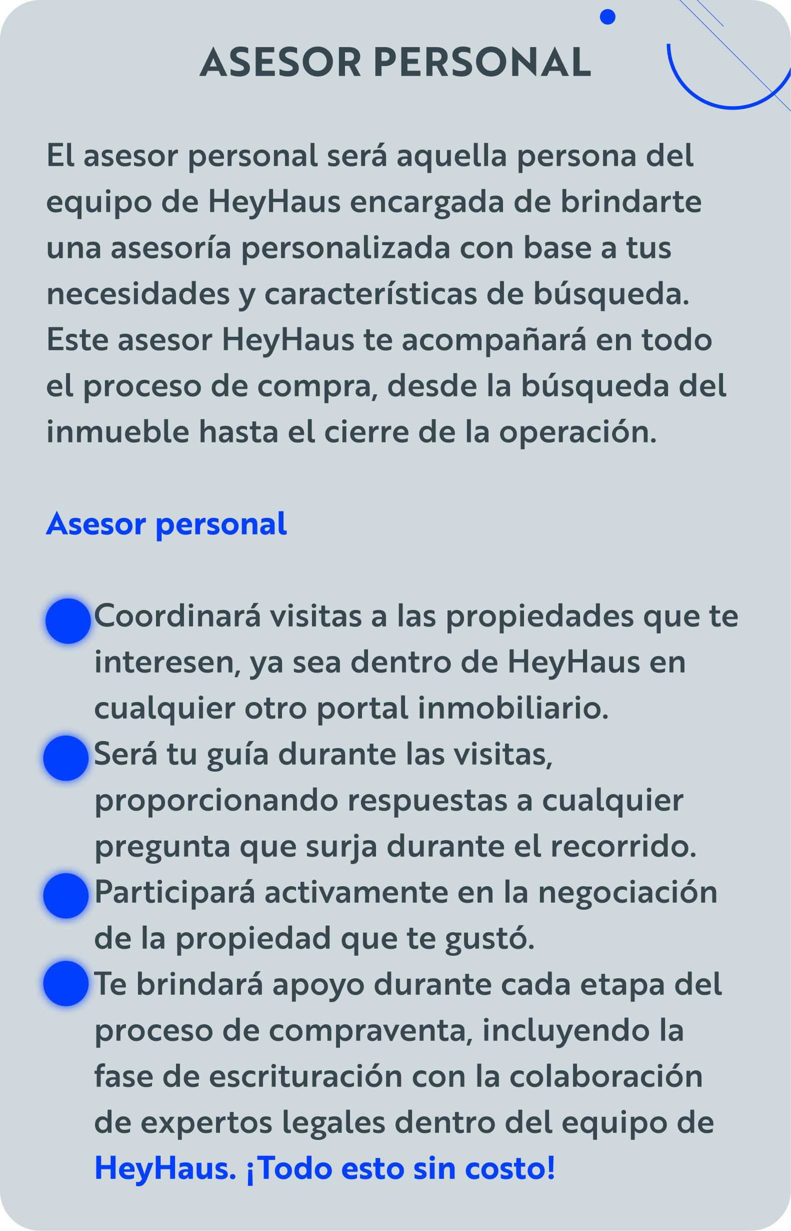 Te ayudaremos y acompañaremos en el proceso para encontrar la propiedad que tanto estas buscando. Con HeyHaus nunca estarás solo.